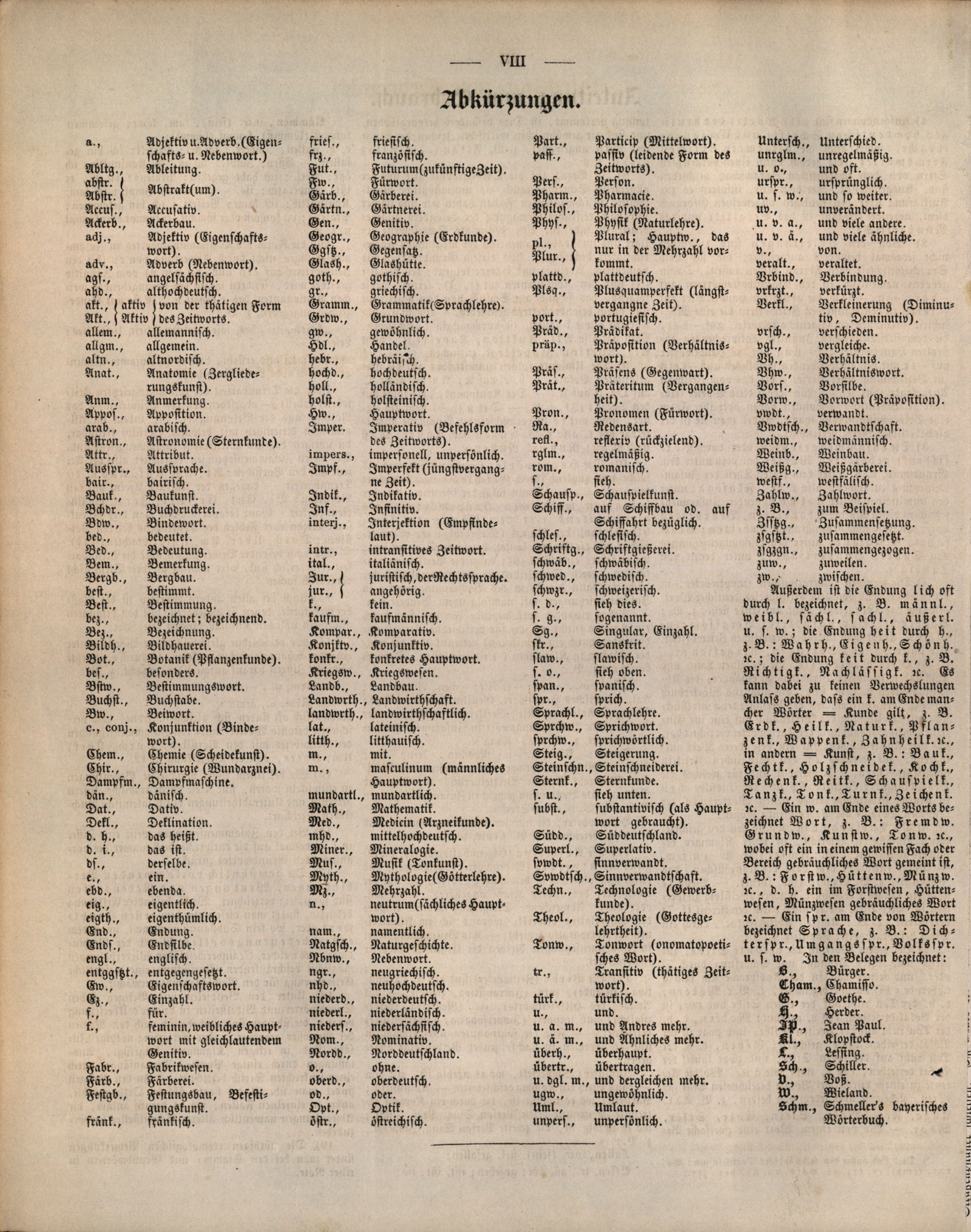 Außerdem ist die Endung lich oft durch l. bezeichnet, z. B. männl., weibl., sächl., sachl., äußerl. u. s. w.; die Endung heit durch h., z. B.: Wahrh., Eigenh., Schönh. etc.; die Endung keit durch k., z. B. Richtigk., Nachlässigk. etc. Es kann dabei zu keinen Verwechslungen Anlass geben, dass ein k. am Ende mancher Wörter = Kunde gilt, z. B. Erdk., Heilk., Naturk., Pflanzenk., Wappenk., Zahnheilk. etc., in andern = Kunst, z. B.: Bauk., Fechtk., Holzschneidek., Kochk., Rechenk., Reitk., Schauspielk., Tanzk., Tonk., Turnk., Zeichenk. etc. — Ein w. am Ende eines Worts bezeichnet Wort, z. B.: Fremdw., Grundw., Kunstw., Tonw. etc., wobei ift ein in einem gewissen Fach oder Bereich gebräuchliches Wort gemeint ist, z. B.: Forstw., Hütten., Münzw. etc., d. h. ein im Forstwesen, Hüttenwesen, Münzwesen gebräuchliches Wort etc. — Ein spr. am Ende von Wörtern bezeichnet Sprache, z. B.: Dichterspr., Umgangsspr., Volksspr. u. s. w. Jn den Belegen bezeichnet:
